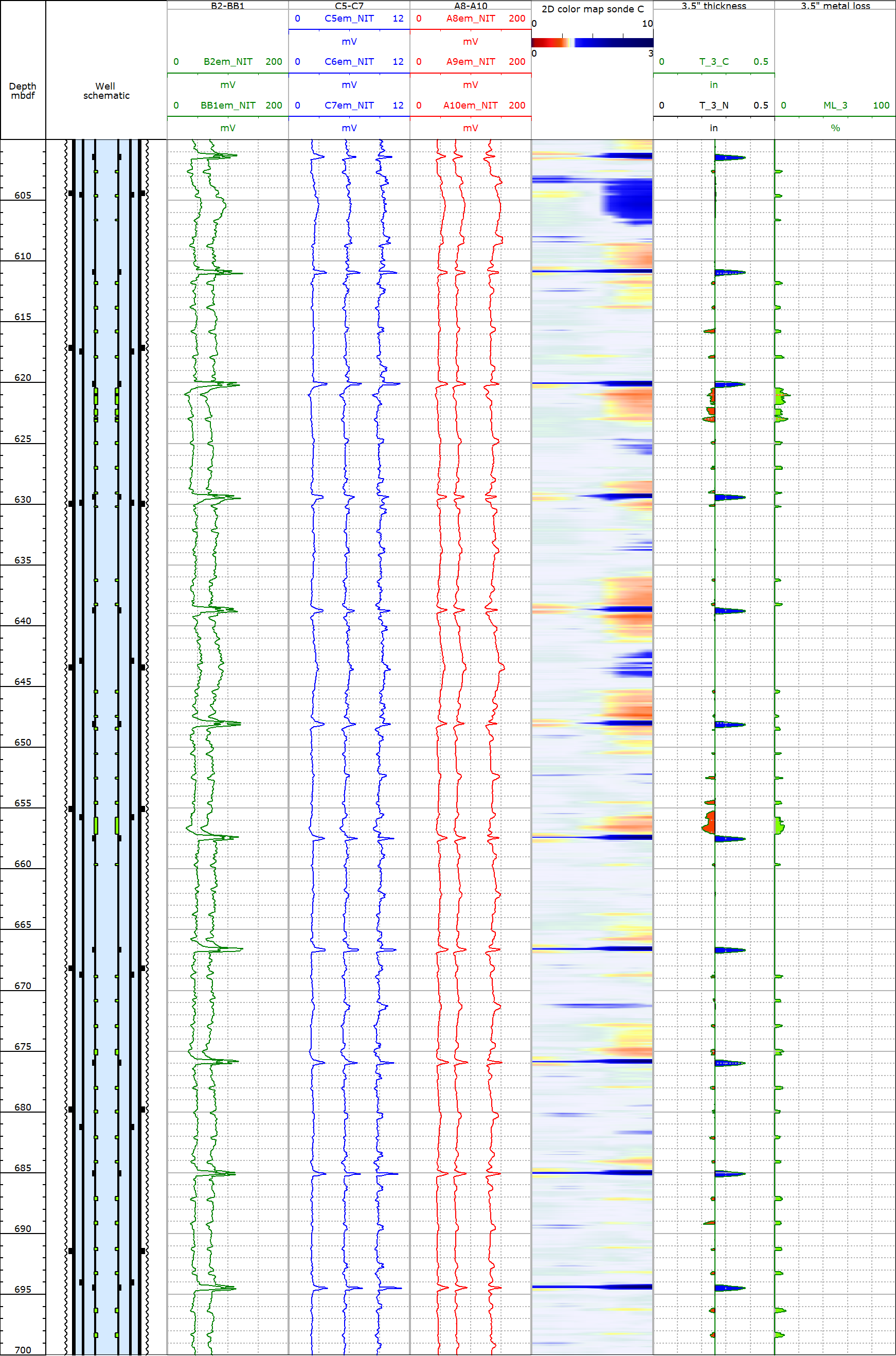 The MFC log data confirmed the EMDs log findings. In addition, the MFC provided very detailed information about the defect locations, size and remaining wall thickness.