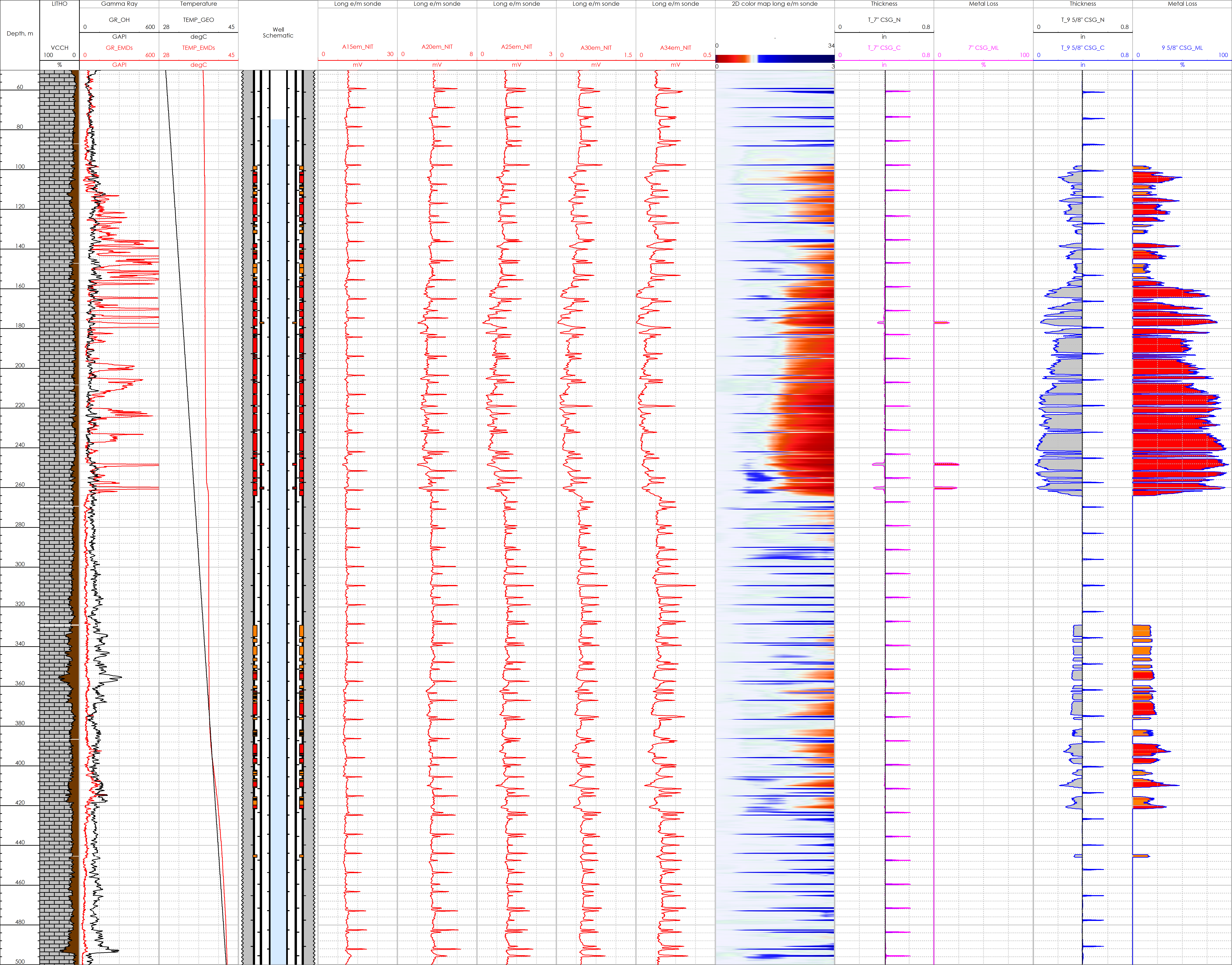 One example when corrosion logging was done in a 3 barrier well (strings) and metal loss on both the casing strings were detected as shown below: