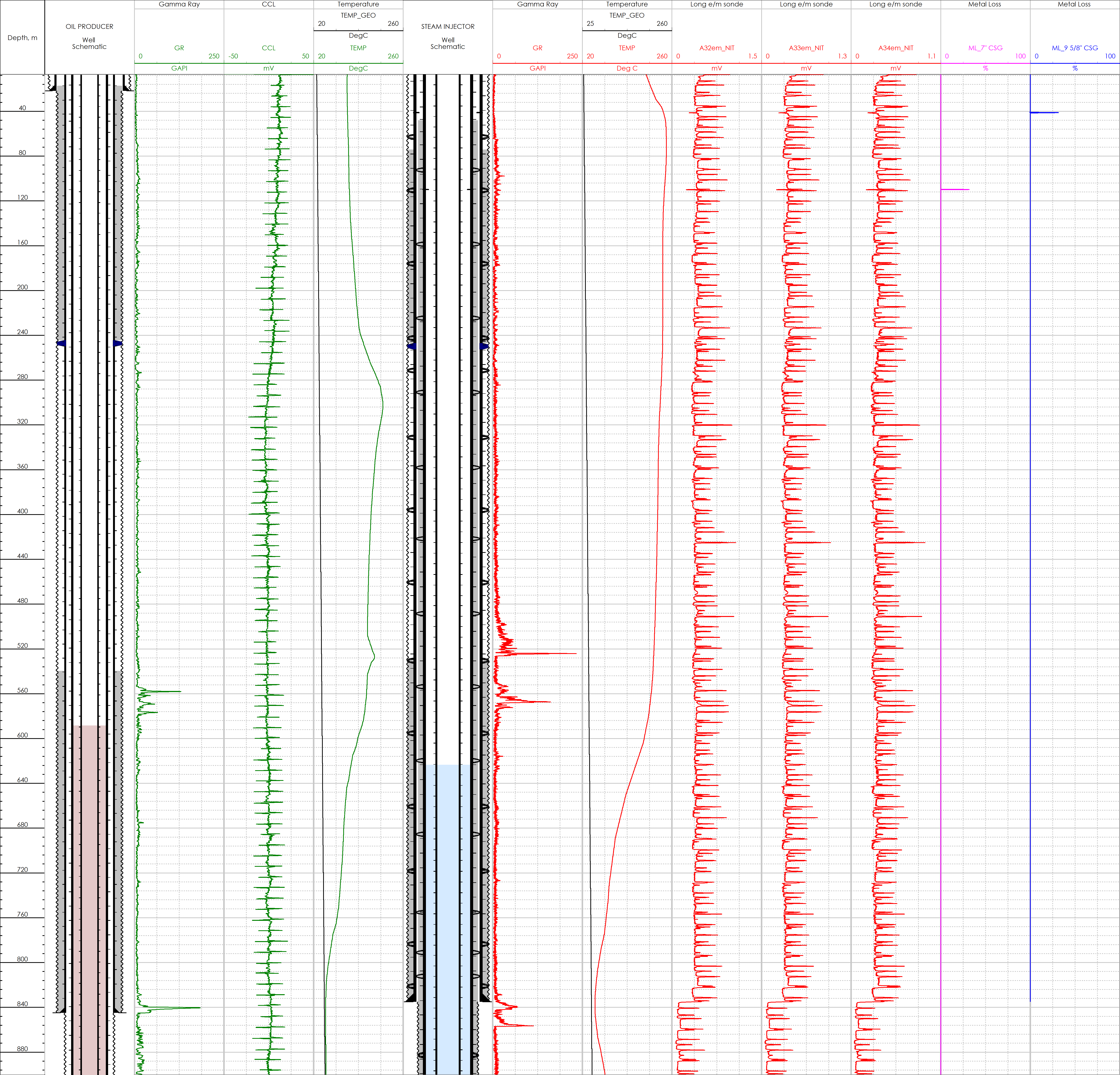 The well is a vertical oil producer drilled in 2016. After drilling the well was completed with 9 5/8” casing, a 7” production casing and a 3.5” progressive cavity pump (PCP) completion. The well was drilled as an infill well in a field with heavy oil and with steam injector wells nearby. In June 2022 after 6 years of production, the average wellhead temperature was approximately 70 degree C, it suddenly increased sharply to 130 deg C. To understand why the temperature had suddenly increased a decision was made to shut the oil producer to cool down Well Head temperature and record temperature profile. The log data indicated that the upper section of the well had heated to a maximum temperature of 205 degree C at a depth of 300 mbdf. The client suspected that there was communication between a nearby steam injector well and the oil producer. To confirm this assumption, the steam injector was closed in and 3 days after the shut-in period a high temperature tool was run in the steam injection well. The log data indicated that the upper section of the well was heated up to a maximum temperature of 260 degree C at a depth of 38 mbdf. The temperature curves indicated a downward crossflow from 41 mbdf to 260 mbdf. The temperature curves, recorded in both wells, indicated that there was a steam breakthrough at the upper section of the production well. To understand the steam injector well integrity failure, it was decided to run a corrosion log in this well. The well was cooled down and corrosion data was recorded from the surface to 900 mbdf. The EMDs data indicated the presence of a localized defect in the 7” casing at a depth of 110 mbdf, below a casing coupling. In addition, a localized defect was identified in the 9 5/8” casing at 41 mbdf. However, it should be noted that there were no indications of any defects in the completion string. Based on the temperature and corrosion data, the steam injector was worked over. During the workover it was identified that a pup joint in the completion string located below the tubing hanger had been insufficiently torqued. This in all probability would have been the entry point for the steam in the A annulus. Additionally, the steam had moved from 110 mbdf (defect in the 7” casing) upwards to 41 mbdf and entered the formation across the defect in the 9 5/8” casing. The client decided to install a patch to cover the defect in the 7” casing to avoid steam flow into the formation.