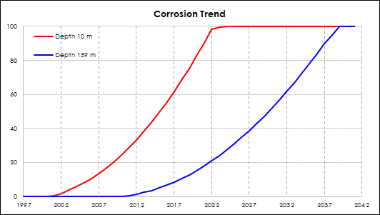 Based on the calculated metal loss from the 2 logging surveys, the corrosion trend for the two intervals were plotted as shown below. It can be seen that the corrosion rate was more aggressive in the upper interval. Taking into consideration the casing pressure test result in 2009, it appeared that the life of the casing from drilling to failure was predicted to be approximately 11-12 years. Metal loss is predicted to reach 100% in 25 years. However, the well will require further corrosion monitoring as there is a high possibility of migration of corrosion to the 7” scab liner.