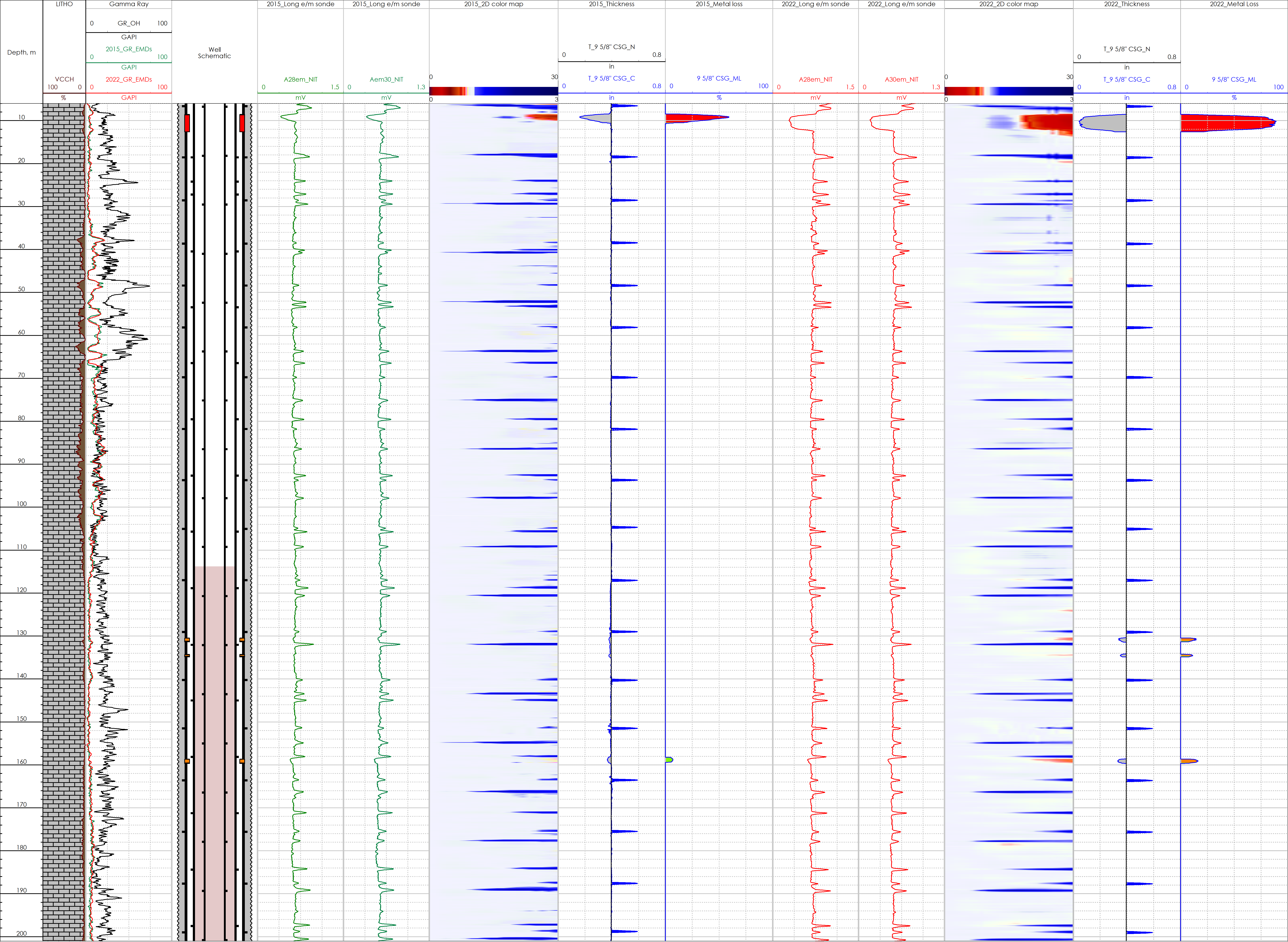 In 2015 EMDs logging was conducted and the log data indicated the presence of 2 intervals of corrosion across the upper section of the well: the first is very shallow with maximum metal loss of 57%, the second is a localized zone at 159 mf with metal loss of 9%.