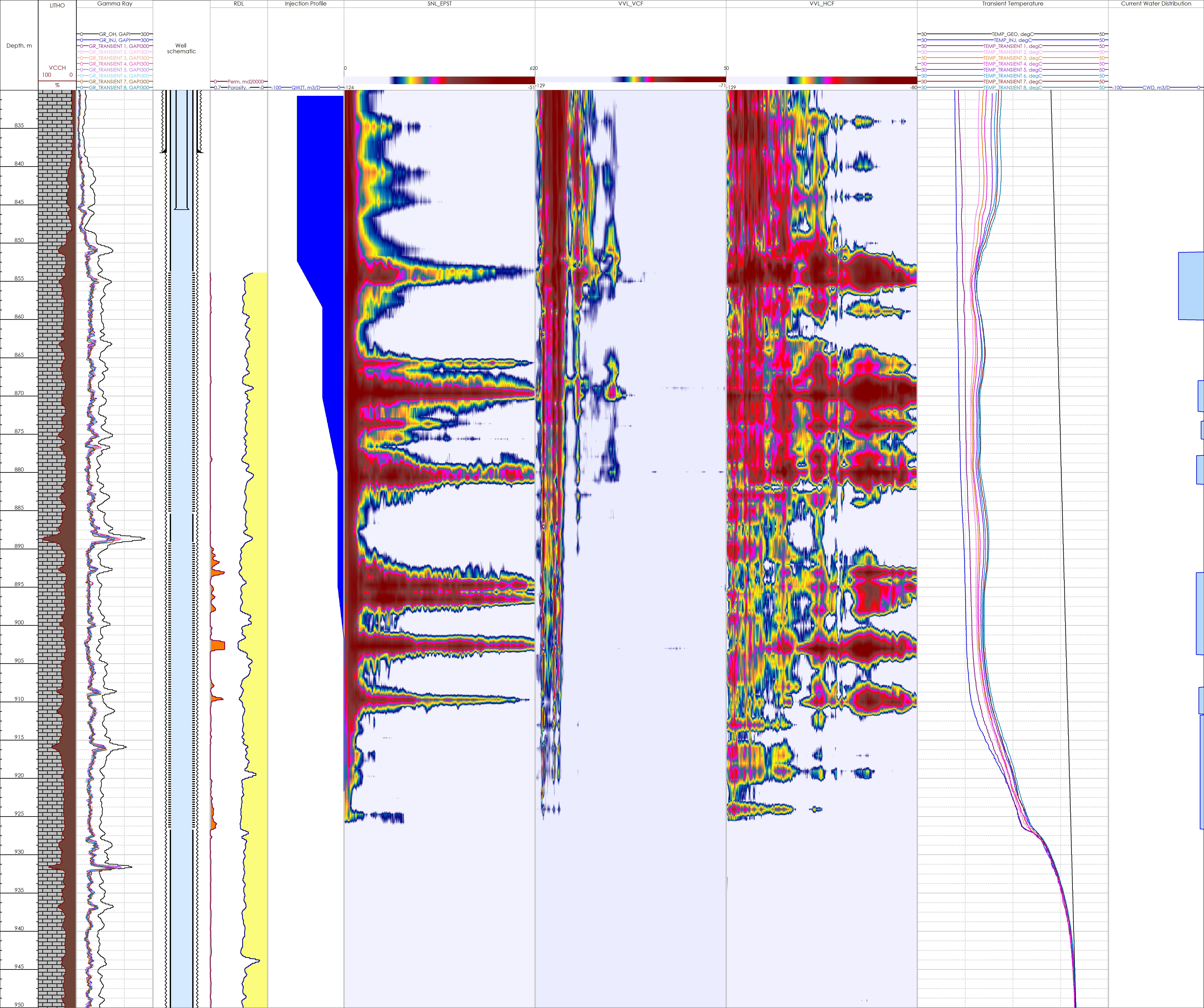 A reservoir flow analysis survey was conducted in 2023. The main objective was to understand the formation intake zones and sweep efficiency. The well was under stable injection conditions prior to logging. A PLT was conducted across the perforated intervals followed by acoustic logging. The well then shut-in and a shut-in PLT survey was conducted, followed by a number of relaxation temperature passes across the same intervals.
