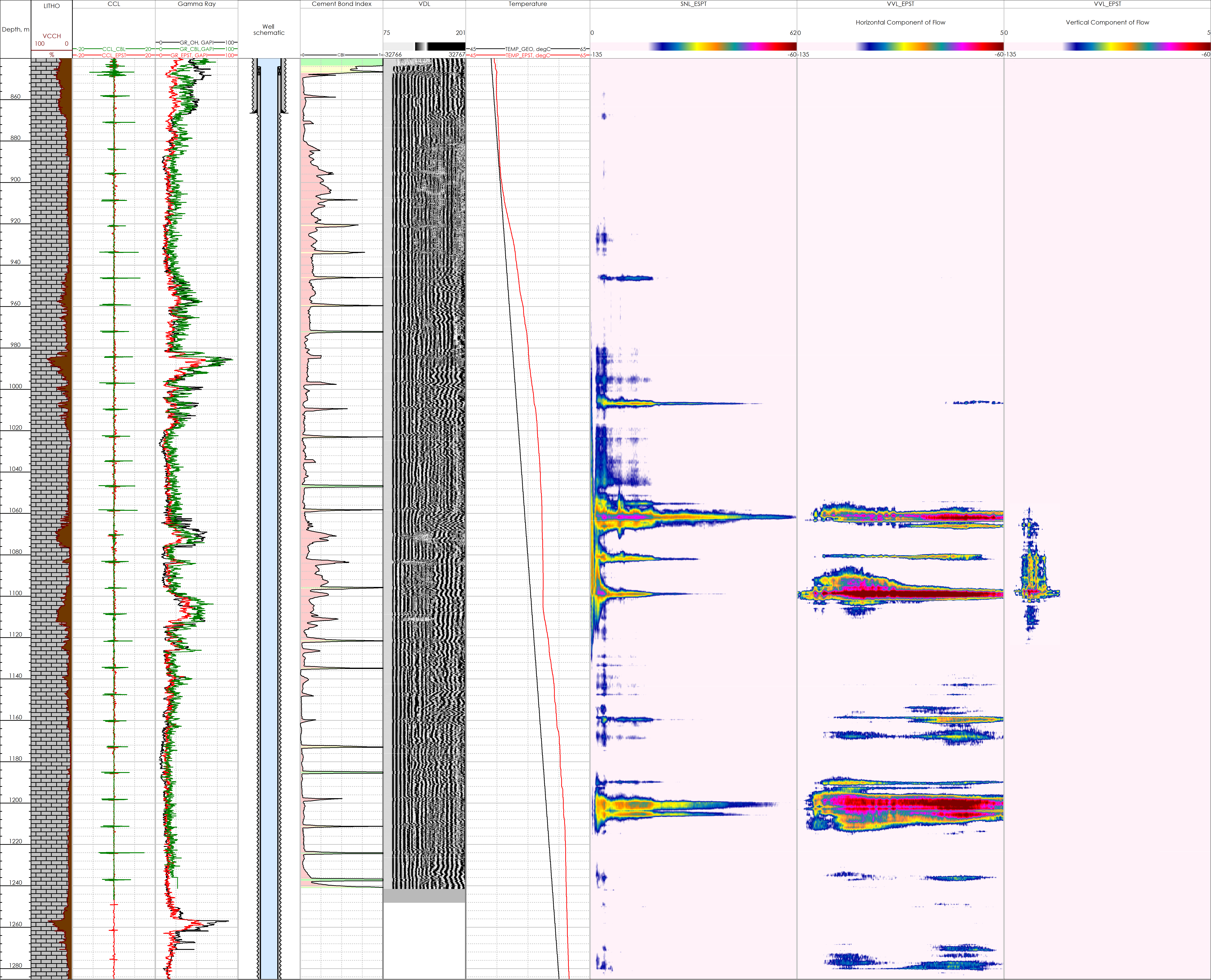 However, the SNL+VVL were run 14 days after the cement job and the acoustic data had a good correlation with the cement bond index. The CBL showed a greater bond index at 850 -980 m and the SNL+VVL did not indicate crossflow behind the liner. Intervals with well-marked noise have the lowest cement bond index.